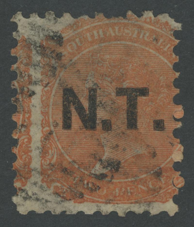 BLACK OVERPRINT: 'N.T.' on QV De La Rue Large Star Wmk Rouletted 2d dull orange SG DO375, rouletting on all sides, very fine part-strike of the rare '[NO]RTHERN TE[RY]/MY3/70[S.A]' cds, Cat £750. Underrated at R; unrecorded unused. Ex Victor Bullock: sold for $1225 (Sale 130 Lot 508). RPSV Certificate (2007). The 'Tamiami' example sold for $1135 (Sale 236 Lot 659). Don Pearce's example - graded 'B' - sold for $685 (Sale 247 Lot 529). Absent from 'Besancon'. [Date range 3.5.1870 to 31.5.1870 only] (Image1)