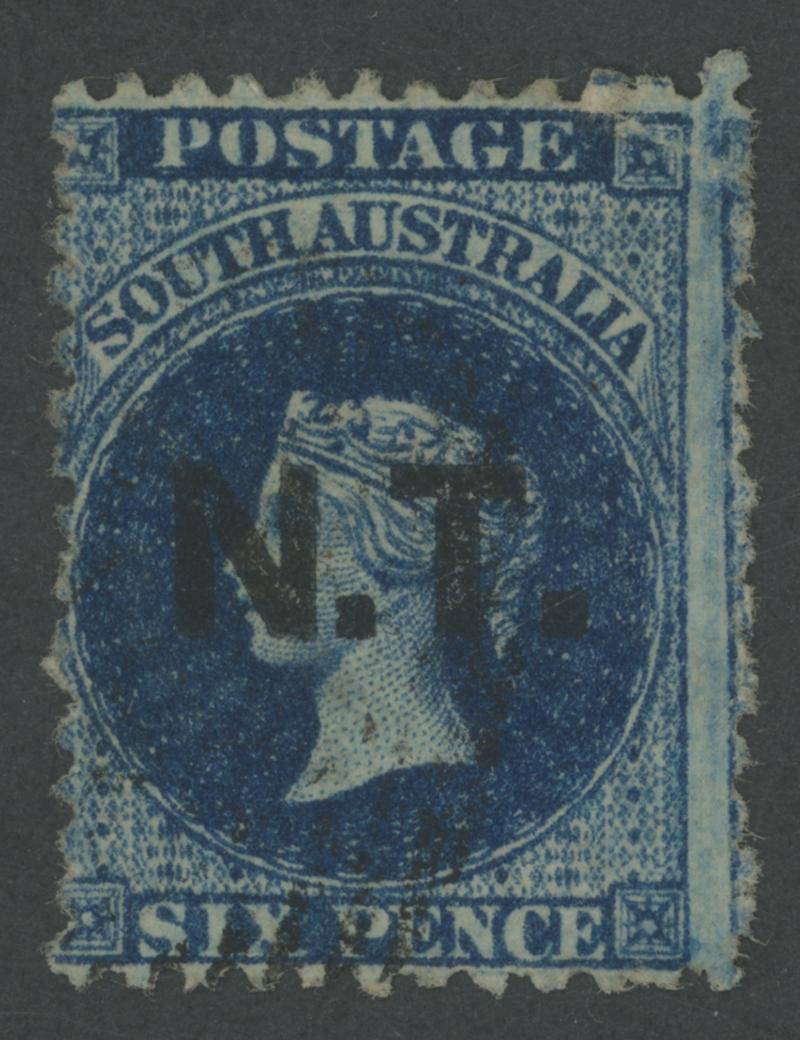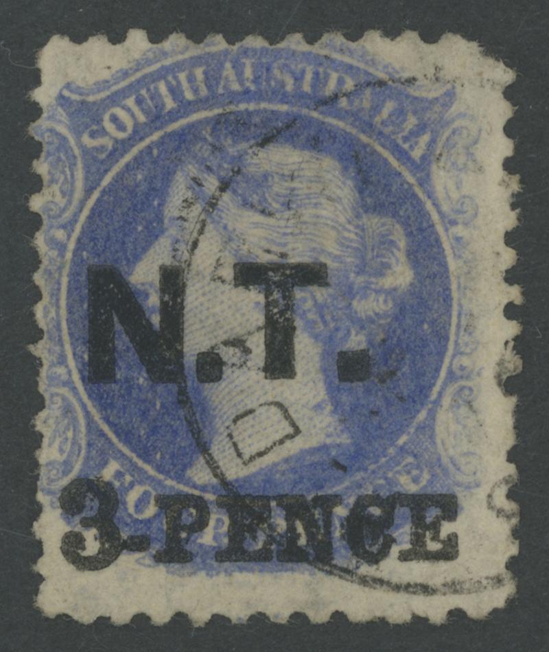 BLACK OVERPRINT: 'N.T.' on QV Perkins Bacon Large Star Wmk Perf 11½-12½ '3-PENCE' on 4d bright ultramarine SG DO377 from the right of the sheet with vertical marginal watermark lines at right, small separation fault at upper-right, light Port Darwin cds, Cat £550. Underrated at RR; unrecorded unused in private hands, the example recorded by Ron Butler being in the institutionalised Sir George Murray collection. Absent from the 'Besancon' collection. Superior to Don Pearce's example - ragged perfs at right - that sold for $805 (Sale 247 Lot 532). Apart from the Governor's Private Secretary ('P.S.'), this is the only user to which the 3d on 4d was allocated. [The only confirmed date is 22.1.1877] (Image1)
