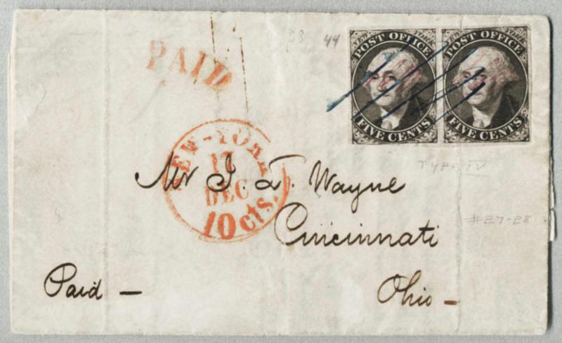 1845, 5+5C, pair, New York Provisional issue by Postmaster, signed ACM - AC connected, from NEW YORK to CINCINNATI/Ohio, manuscript cancel with blue ink, red PAID and NEW YORK 17 DEC 10 cts. dispatch, lower left side stamp is touched other margins are clear to very fine, right stamp with vertical crease, on reverse multiple hinge remnants, despite all the faults a scarce letter, interesting and desirable still, F! Estimate 2.000€.