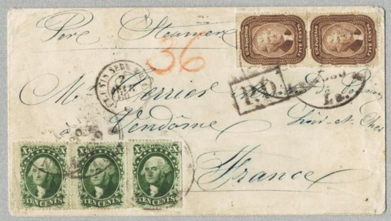 1860, 5c vertical pair + 10c (3), on cover from NEW ORLEANS to France, on front with boxed P.D handstamp, France transit cds, on reverse with transit and arrival cancels, right 5c. stamp right upper is with short corner and the right 10c stamp right side is without perforation, cert. Jakubek, F-VF! Estimate 900€.
