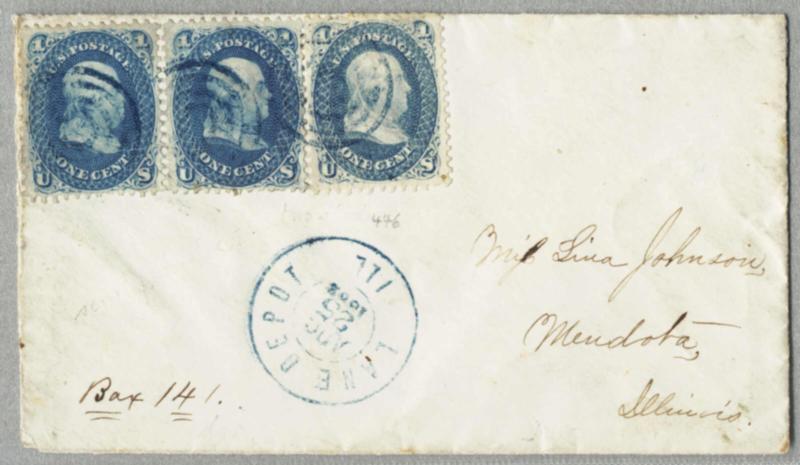 1862, 1c. horizontal pair + 1c., blue and pale milky blue, on cover from LANE DEPOT, ILL. to MENDOTA, ILL., stamps bearing blue circular cancellation, on front with blue LANE DEPOT ILL AUG 25 1862 double cds, attractive and desirable, VF-XF! Estimate 150€.