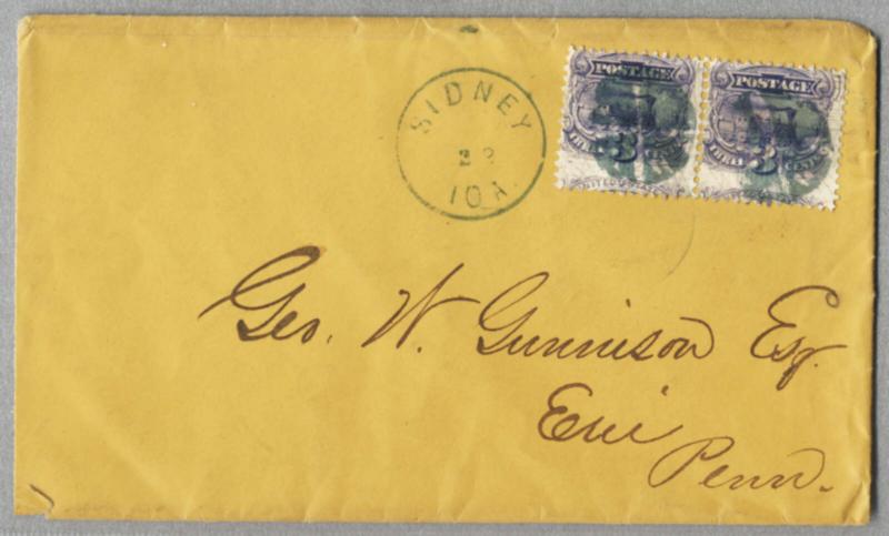 1869, 3c+3c, ultramarine, horizontal pair, neatly cancelled with blue mute cork handstamp and blue aside SIDNEY 23 10A on yellow cover from SIDNEY to ERIE, Pennsylvania, fresh and desirable, VF-XF! Estimate 300€.