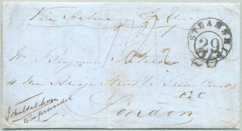 1859, stampless cover from MEXICO CITY to LONDON via HABANA forwarded per steamship, cancelled STEAMSHIP 29 and 26 c rate handstamp, m/s 2 1/2 d, receiving backstamp in red LONDON DE 19 59, interesting and desirable, VF-XF! Estimate 400€.