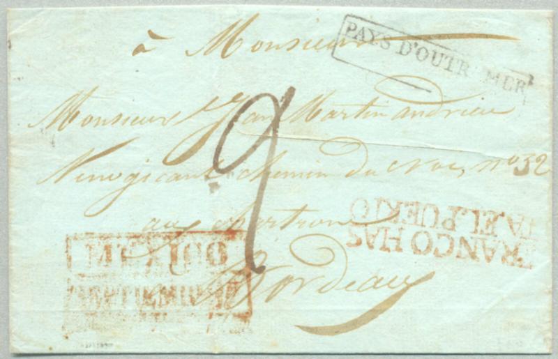 1834, prephilatelic letter from MEXICO CITY to BORDEAUX/France, cancelled with boxed red MEXICO date stamp and red FRANCO HASTA EL PUERTO two-line handstamp, boxed PAYS D'OUTREMER handstamp and 2 Decimes due rate, receiving backstamp BORDEAUX and fumigation slit due to cholera epidemic, very fine and desirable letter, XF! Estimate 400€.