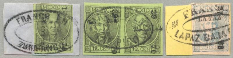 1868-1871, 12c - 25c, a small lot of (3), imperf, 12c in pair, rare 25c thin figure LA PAZ district opt stamp, cancelled with ZUMPANGO, TAMPICO, LAPAZ BAJA(CALA), (Schatzke 213, 699, 1581), ex Provera, rare and desirable lot, XF! Estimate 600€.