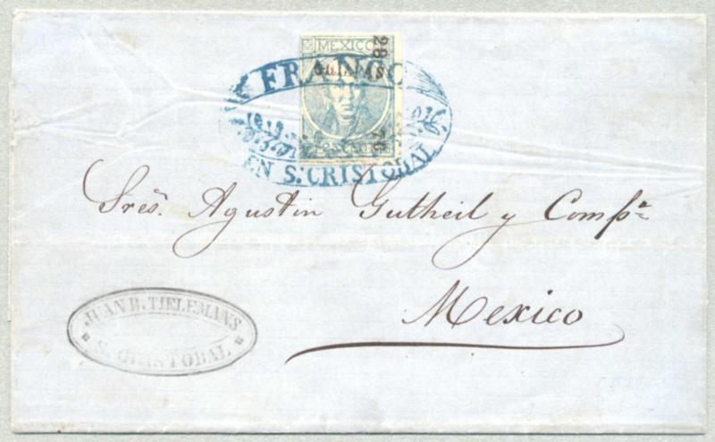 Automatisch generierte Übersetzung: 1870, 25c, blau, ungezähnte, CHIAPAS Landkreis, auf Brief von SAN CHRISTOBAL zu Mexiko, entwertet mit Blau FRANCO EN S. CHRISTOBAL (Schatzke 125), ex Provera, Briefmarke leicht links berührt, frisch und gesucht Ganzstück, Kabinett! Schätzpreis 800 EUR.(Image)
