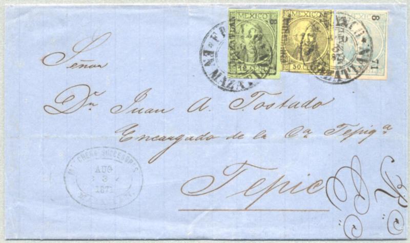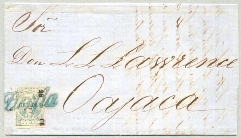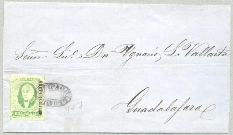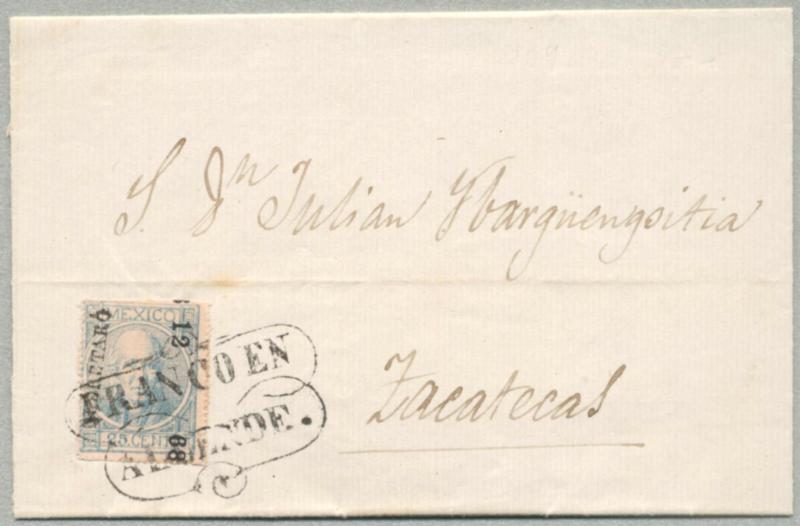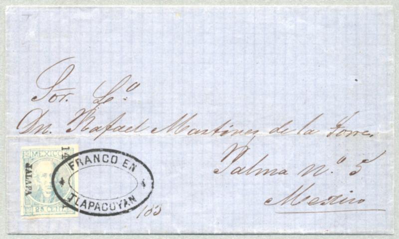 1871, 25c, blue, imperf, JALAPA district, on letter from TLAPACOYAN to MEXICO, cancelled with FRANCO EN TLAPACOYAN (Schatzkes 644), reverse with arrival MEXICO, ex Provera, stamp with precut, still desirable entire, VF! Estimate 500€.