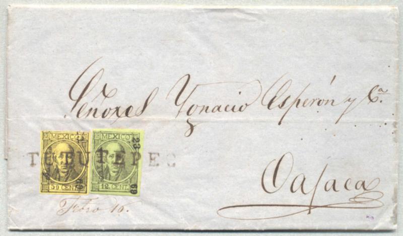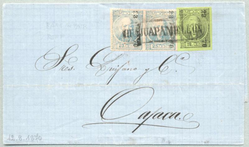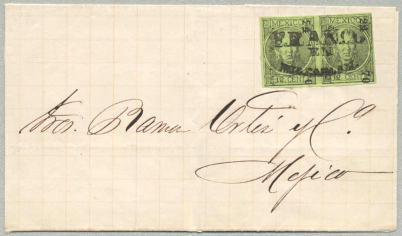 1870, 12c, black/green, pair on folded letter, imperf, MORELIO district, on letter from MIACATLAN to MEXICO, cancelled with FRANCO EN MIACATLAN (Schatzke 225), ex Provera, exceptionally fresh and desirable entire, XF! Estimate 600€.