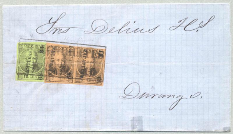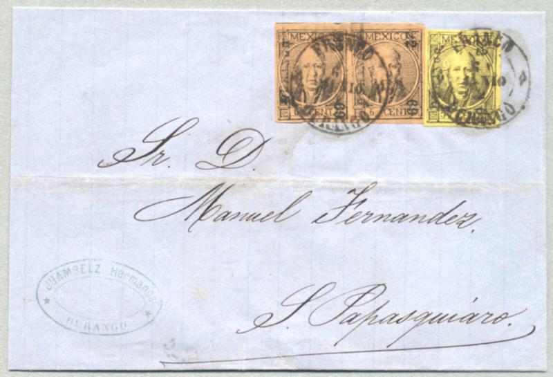 Automatisch generierte Übersetzung: 1868,50c + 6 (2), Paar, dünn Ziffern, ungezähnte, DURANGO Landkreis, auf Brief von DURANGO zu PAPASQUARIO, gestempelt mit FRANCO DURANGO (Schatzke 238), ex Provera, alle vollrandig, seltene Kombination, frisch und gesucht, VF-XF! Schätzpreis 600 EUR.(Image)