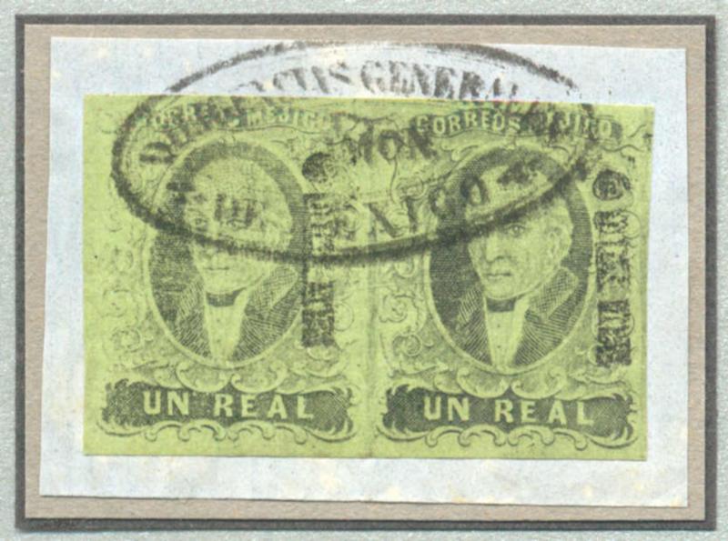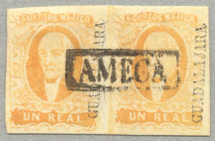 Automatisch generierte Übersetzung: 1856, erster Hidalgo Ausgabe, 1 r, gelb, Paar, mit GUADALAJARA Landkreis Überdruck, mit einem sauberen Abschlag von AMECA (Schatzkes 314), sehr frisch und gesucht, Kabinett! Schätzpreis 300 EUR.(Image)