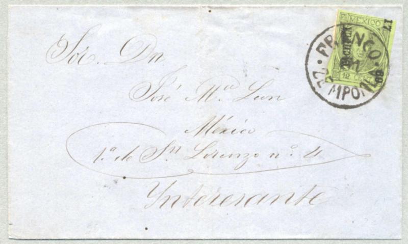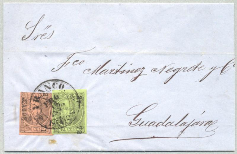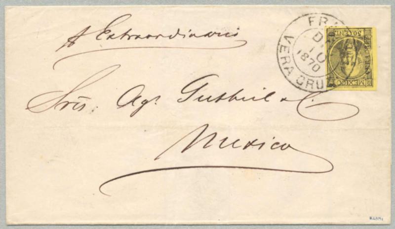 1870, 50c, black/yellow, imperf, VERACRUZ district, on letter from LEON to GUADALAJARA, cancelled with FRANCO VERACRUZ (Schatzke 502), ex Provera, exceptionally fresh and desirable entire, XF! Estimate 400€.