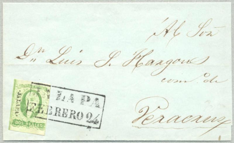 1856, first Hidalgo issue, 2 r, green, with district opt JALAPA, with a clear strike of JALAPA / FEBRERO 24, very fresh and desirable, XF! Estimate 400€.