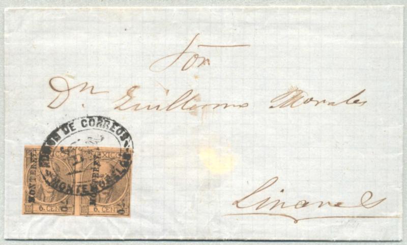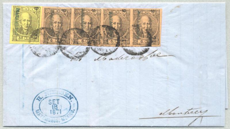 Automatisch generierte Übersetzung: 1871,50c + 6c (4), 2 Paare, ungezähnte, blau MATAMOROS Landkreis Überdruck, auf Brief von MATAMOROS zu MONTEREY, gestempelt mit unscharf DE MATAMOROS Stempel (Schatzke 735), ex Provera, senkrechter Bug dadurch erster 6c Briefmarke, noch sehr interessante Frankatur und gesucht Ganzstück, G-VF! Schätzpreis 1. 000 EUR.(Image)