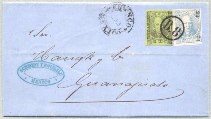 1870, 25c, blue, imperf, CHIAPAS district, on letter from SAN CHRISTOBAL to MEXICO, cancelled with blue FRANCO EN S. CHRISTOBAL (Schatzke 125), ex Provera, stamp slightly touched at left, fresh and desirable entire, XF! Estimate 800€.