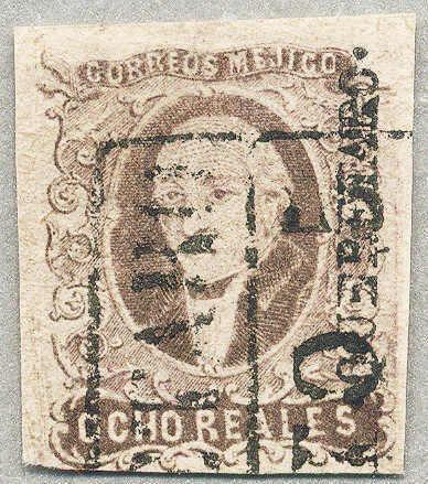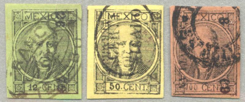 1869-72, 12 c. black on green paper, 50 c. black on yellow paper, 100 c. black on brown paper, cancelled TENABO (unknown to Schatzkes), VERACRUZ (unknown to Schatzkes), MAZATLAN, used, margins good to huge, very interesting and desirable lot, VF-XF! Estimate 600€.