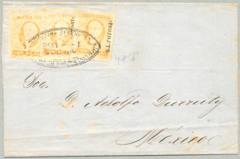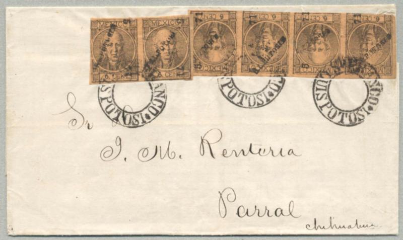 Automatisch generierte Übersetzung: 1871,6c, schwarz/gelbbraun, Viererstreifen und Paar, ungezähnte, S. L. POTOSI Landkreis, auf Brief von S. L. POTOSI zu PARRAL, gestempelt mit FRANCO S. LOIS POTOSI (Schatzkes 1460), ex Provera, unten links von Streifen und links oben von Paar leicht berührt, noch interessant und gesucht Ganzstück, F-XF! Schätzpreis 600 EUR.(Image)