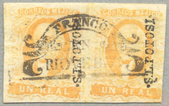 Automatisch generierte Übersetzung: 1856, erster Hidalgo Ausgabe, 1 r, gelb, Paar, mit Landkreis Überdruck S. L. PETOSI, mit einem sauberen Abschlag von RIO VERDE, (Schatzkes 1527), sehr frisch und gesucht, Kabinett! Schätzpreis 300 EUR.(Image)