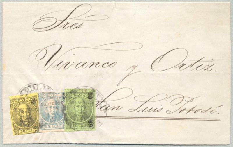 1868, three colour franking, 12+25+50c, imperf/perf, TAMPICO district, on letter from TAMPICO to SAN LUIS POTOSI, cancelled with CORREOS TAMPICO, ex Provera, 25c and 50c both touched/cut, still fresh and desirable entire, F-VF! Estimate 500€.