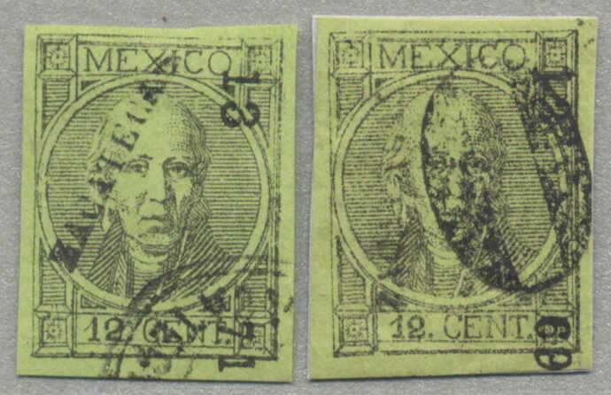 1869/71, 12c, black/green, (2), imperf, ZACATECAS district, used part ZACATECAS and full AGUASCALIENTES (Schatzkes 1854 and 1930), ex Provera, fresh and desirable, VF-XF! Estimate 200€.