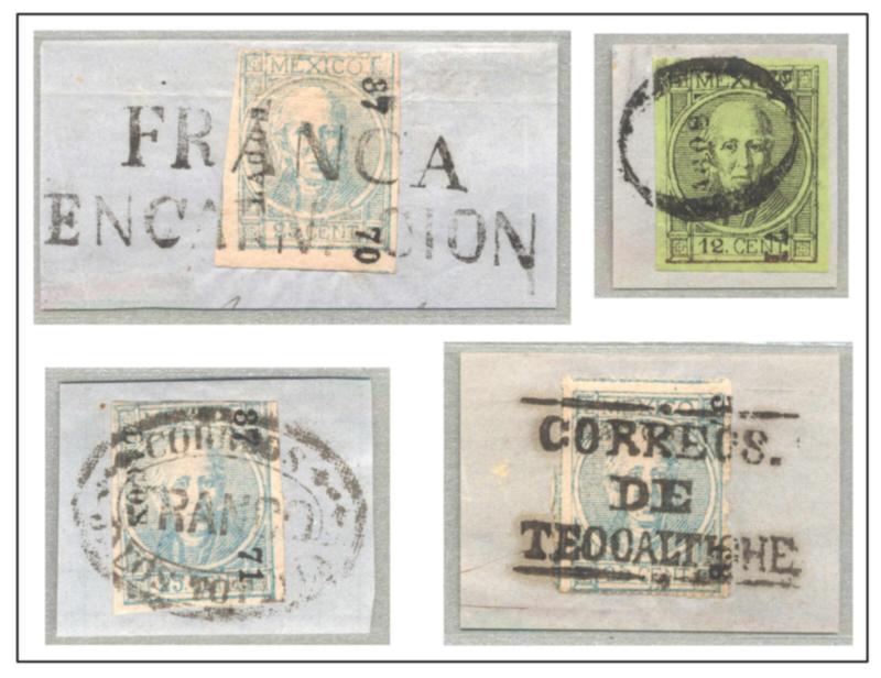 1868-71, 12+25c(3), (1) 25c thin figures, (3) thick figues, imperf/perf, all LAGOS district opt except TEOCALTICHE without opt, all on pieces, cancelled with FRANCA ENCARNAION, mute O, JALOSTOTITLAN and TEOCALTICHE, ex Provera, FRANCA with light horizontal crease, still fresh and desirable lot from LAGOS district, F-XF! Estimate 600€.