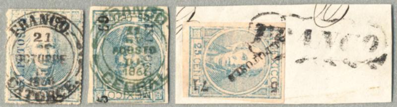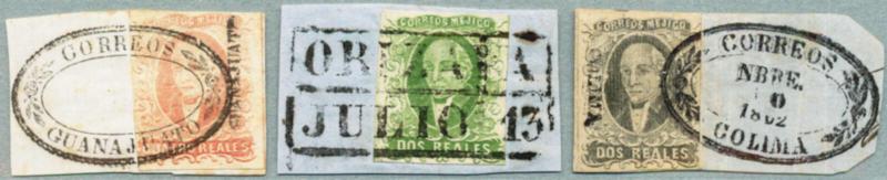 1856/61, small lot of (3), all on piece, luxury cancels from GUANAJUATO (Schatz. 472), ORIZAVA (Schatz. 1090) and COLIMA (Schatz. 179), beautiful lot, very fresh and desirable, XF! Estimate 400€.