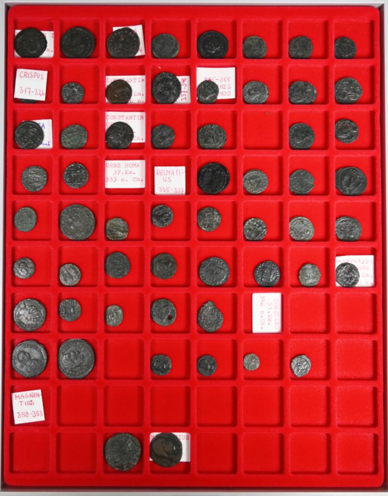 Antike 2 Lindnerboxen und eine Albumseite mit ca. 100 römischen und byzantinischen Klein- und Mittelbronzen, meist in geringer Erhaltung. (Image)