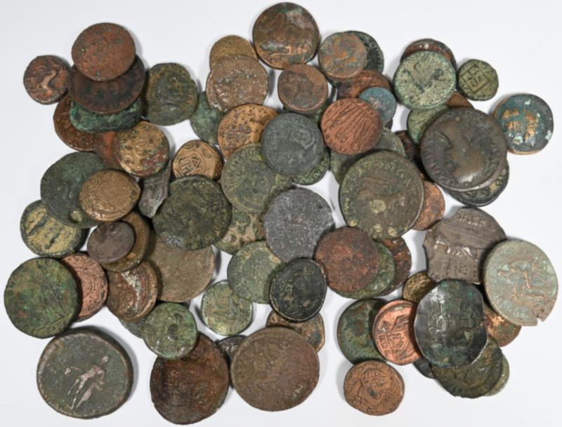 Antike Eine Tüte mit ca. 70 antiken Münzen, alle unbestimmt. Gekauft wie besichtigt / bought as viewed, no return. (Image)