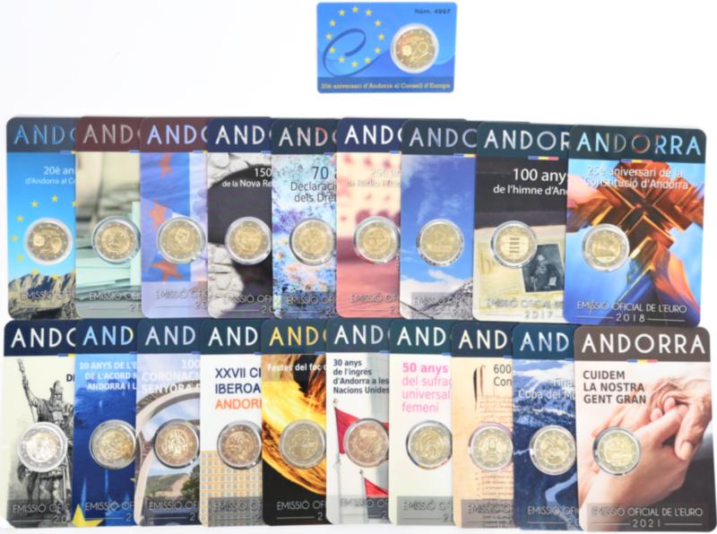 Andorra 2 Euro Gedenkmünzen komplett 2014-2023: 19 x original Blister in st sowie 1 x in PP, wie von Andorra ausgegeben, 2014 1x, ab 2015 beide Ausgaben. Tolle Gelegenheit für die Eurosammler, Andorra vollständig zu bekommen. Katalog-Nummer(n) : 2 EUR (Image)