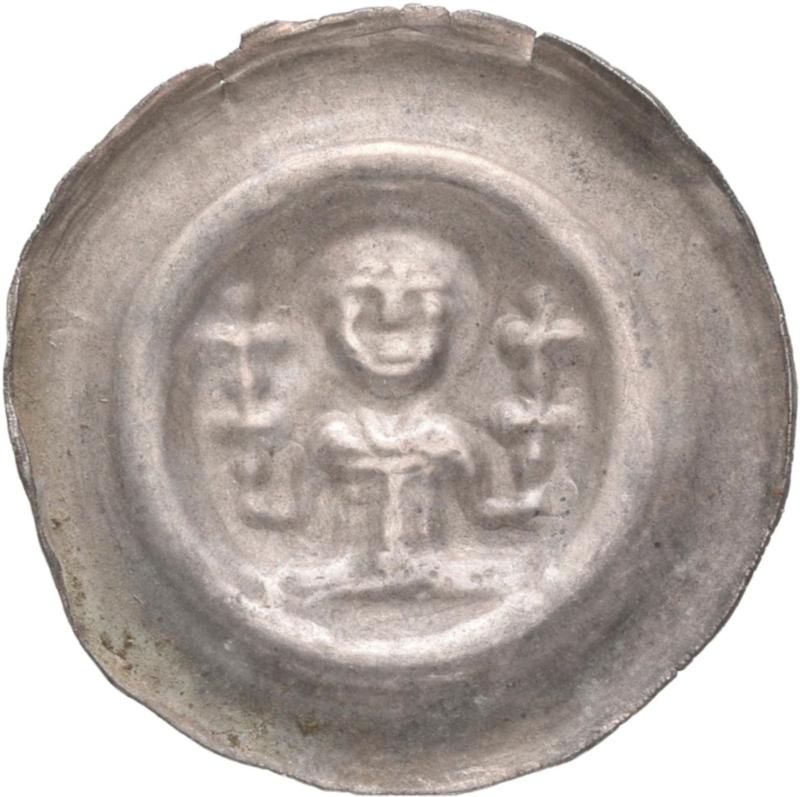 Altdeutschland und RDR bis 1800 Halberstadt-Bistum, Ludolf I. von Schladen 1236-1241: Brakteat; Brustbild des Hl. Stephan mit 2 Doppelkreuzstäben von vorne über Mauer; Besser/Brämer/Bürger 20.07; 0,59 g, sehr schön+. (Image)