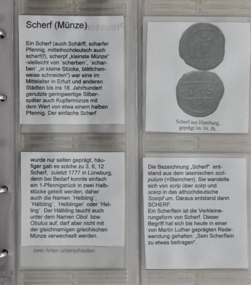 Altdeutschland und RDR bis 1800 Hamburg: Album mit 18 liebevoll zusammengetragenen Münzen ab 13tes Jhd. Dabei Hohlpfennig, Witten, Hohlscherf, Blaffert, Scherf, Dreiling, Sechsling oder Schillinge. Alle bestimmt mit kleinen Beschreibungszetteln und Abbildungen. (Image)