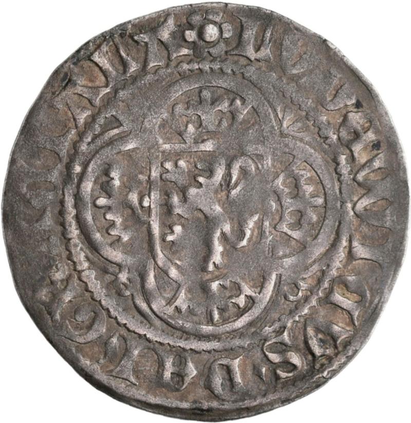 Altdeutschland und RDR bis 1800 Hessen, Ludwig I. 1413-1458: Kronichter Groschen o.J. Löwenschild auf Blumenkreuz im Vierpaß, mit altem Beschreibungszettel. Sehr schön+ (Image)