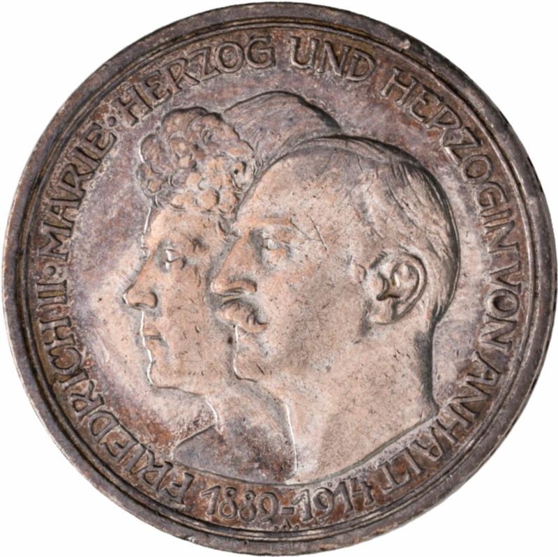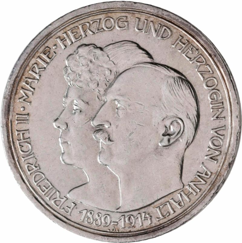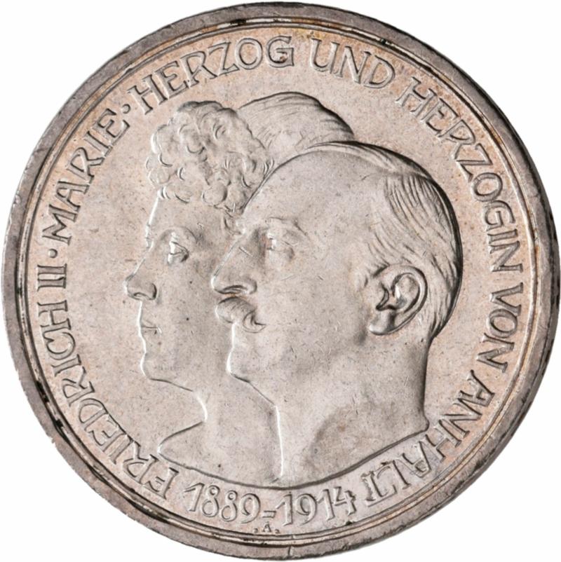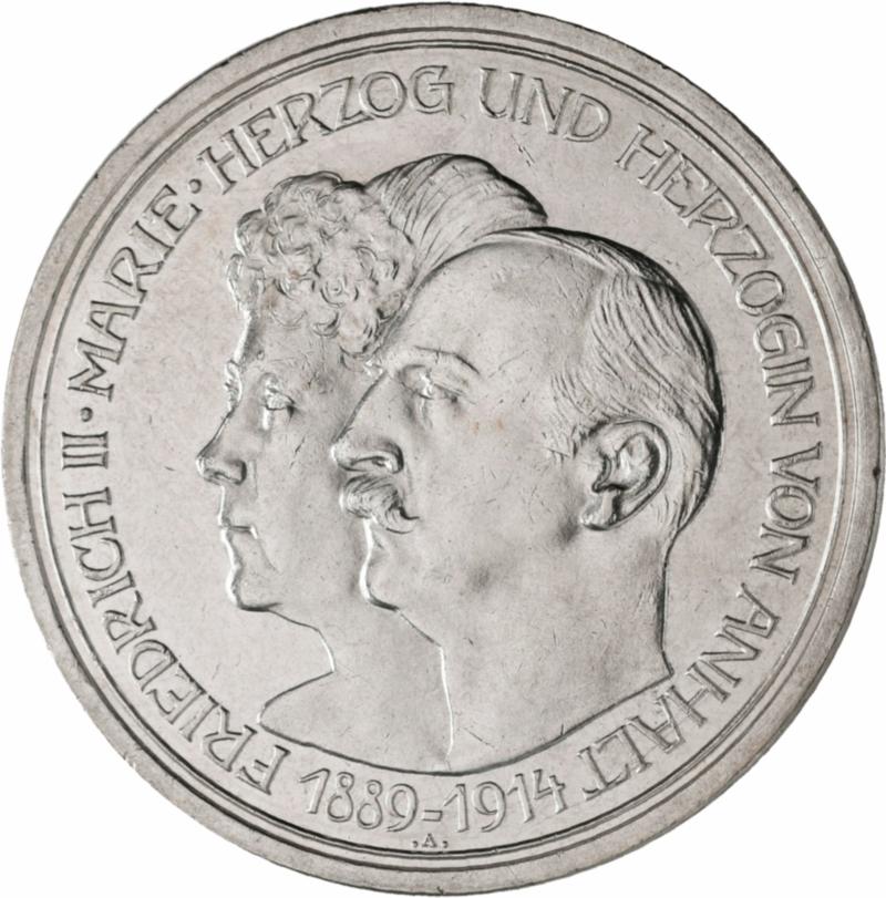 Anhalt Friedrich II. 1904-1918: 3 Mark 1914 A, Silberhochzeit mit Gemahlin Marie von Baden, Jaeger 24, kleine Kratzer und Randfehler, fast vorzüglich. Katalog-Nummer(n) : J 24 (Image)