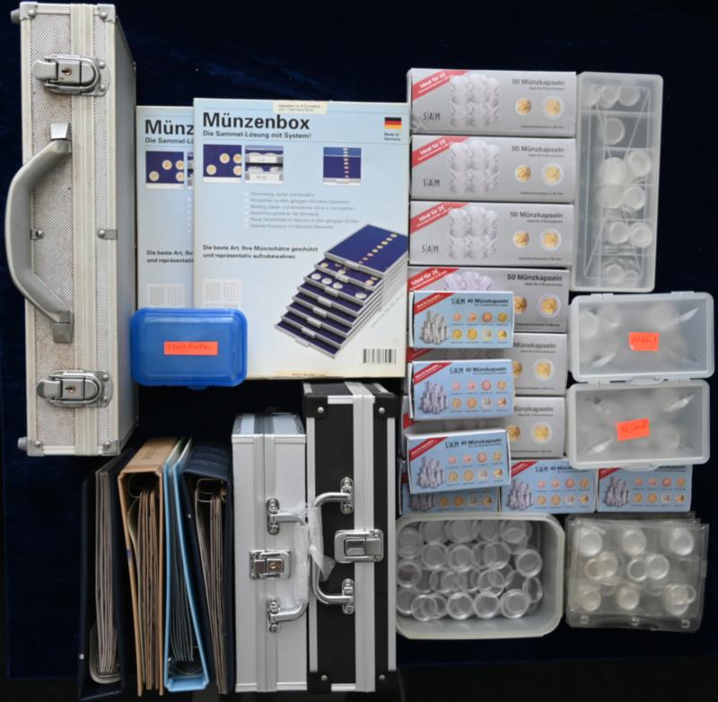 Zubehör Karton mit Münzkoffer, Münzschuber, Alben und Kapseln. Leergut, meist Neu oder Neuwertig. Bevorzugt an Selbstabholer abzugeben. Kein Versand ins Ausland - No Shipping outside of Germany. This lot is "Gebotslos". The Minimum Bid is 20 €, it will be sold at the HIGHEST BID (not one bidding step above the second highest bid). (Image)