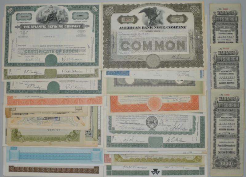 Alte Aktien / Wertpapiere Lot 68 Aktien / Gold Bonds / Optionsscheine / Warrants. Ab 1880 - 1980, oft USA der 60er/70er Jahre, aber auch ältere und Ausland dabei. Sehr dekorativ. This lot is "Gebotslos". The Minimum Bid is 20 €, it will be sold at the HIGHEST BID (not one bidding step above the second highest bid). (Image)