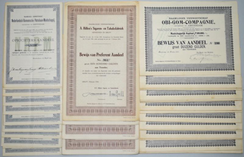 Alte Aktien / Wertpapiere Niederlande: eine Schachtel mit über 120 diversen Aktien / Stock certificate / Bewiis van Aandeel / Loterij Geldeening ab ca 1871 über 1914 bis zum Jahr 1930. Einige mehrfach vorhanden. (Image)