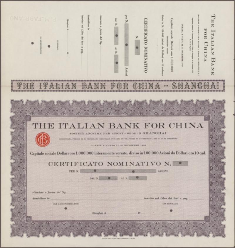 Alte Aktien / Wertpapiere The Italian Bank for China, Blankoaktie von 1949, Shanghai. Wohl aufgrund der politischen Entwicklungen in China 1949 niemals ausgegeben. II (Image)