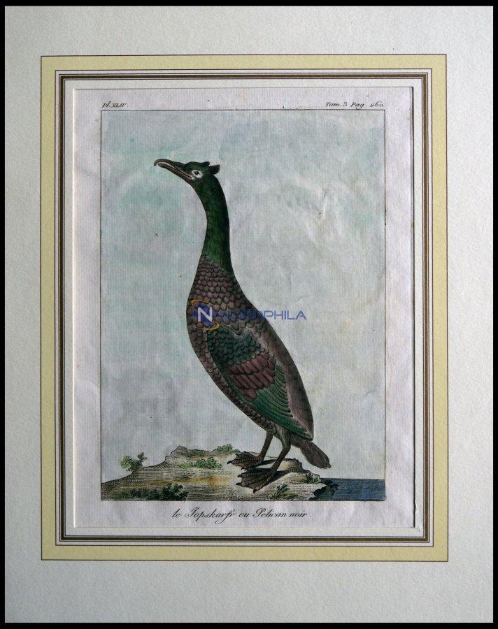 the pelican (le jopskarfr ou Pelican noir), coloured copper engraving by Olafsen made of atlas you voyage en Islande from 1802 (Image)