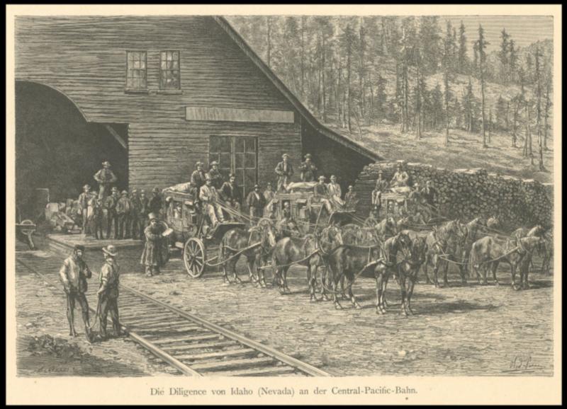 NEVADA, "the Diligence from Idaho (Nevada) at the central Pacific train, wood engraving by 1889 (Image)