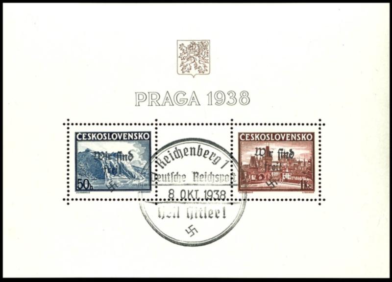 Souvenir sheet issue "PRAGA 1938" with handstamp overprints "we are free! Plus swastika", centric cancellation with special cancel "Liberec 1 8 October 1938", very fine, issued only 300 examples, expertized Dr. Dub, Mahr BPP and expertise Robert Brunel VP (2023) "the condition is perfect. ", Michel 3.000.- (Bl.4) Certificate Blockausgabe "PRAGA 1938" mit Handstempelaufdrucken "Wir sind frei! + Hakenkreuz", zentrisch gestempelt mit Sonderstempel "Reichenberg 1 8 OKT. 1938", tadellose Erhaltung, Auflage nur 300 Exemplare, geprüft Dr. Dub, Mahr BPP und Expertise Robert Brunel VP (2023) "Die Erhaltung ist einwandfrei.", Mi. 3.000.- (Image)