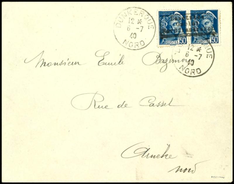 50 C blue, horizontal pair with hand stamp type I on cover DUNKERQUE 6.7.40 to Arneke, arrival 6.7.40, superb, signed Krischke and Pickenpack (3I) 50 C blau, waagerechtes Paar mit Handstempel Type I auf Brief DUNKERQUE 6.7.40 nach Arneke, Ankunft 6.7.40, Pracht, signiert Krischke und Pickenpack (Image)