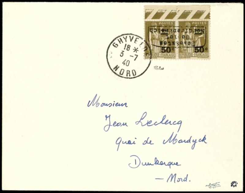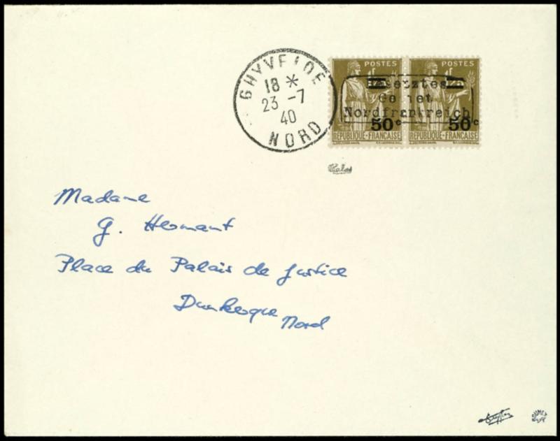 50 C. Postage stamps issue "peace allegory with new value 50 C. " with overprint in type I, variety "inverted overprint", properly franked multiple franking on cover from "Ghyvelde 3.07.1940" to Dunkirk with arrival postmark on the back from 04.07.1940, very fine, expertized Calves, Dreyfus, Roumet and expertise Lothar Herbst VP (2025) "the condition is perfect. The stamps are only in very small number of pieces known, therefore are they very rare. Multiple franking of this issue with inverted overprint are extremely rare. ", Michel 2.200.- (73K(2)) Certificate 50 C. Freimarkenausgabe "Friedensallegorie mit neuem Wert 50 C." mit Aufdruck in Type I, Abart "kopfstehender Aufdruck", portogerechte Mehrfachfrankatur auf Brief von "Ghyvelde 3.07.1940" nach Dünkirchen mit rückseitigem Ankunftsstempel vom 04.07.1940, tadellose Erhaltung, geprüft Calves, Dreyfus, Roumet und Expertise Lothar Herbst VP (2025) "Die Erhaltung ist einwandfrei. Die Marken sind nur in sehr geringer Stückzahl bekannt, daher sind sie sehr selten. Mehrfachfrankaturen dieser Ausgabe mit kopfstehendem Aufdruck sind äußerst selten.", Mi. 2.200.- (Image)