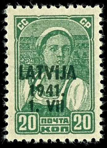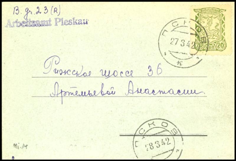 20 Kop. Postal stamp on form card of the Bureau of Labor with cancellation from 27 3 42, sound, photo expertize Robert Brunel VP (2023) : "the condition is perfect. " (14A) Certificate 20 Kop. Freimarke auf Vordruckkarte des Arbeitsamtes mit Entwertung vom 27 3 42, tadellos, Fotobefund Robert Brunel VP (2023): "Die Erhaltung ist einwandfrei." (Image)