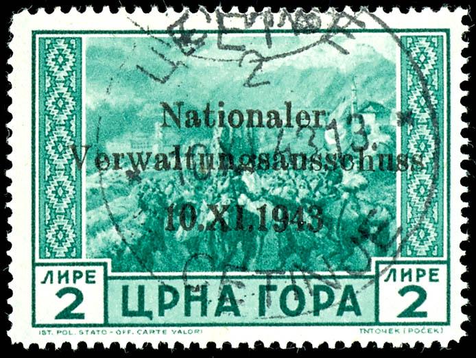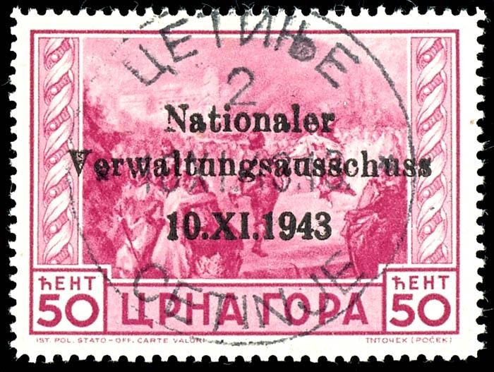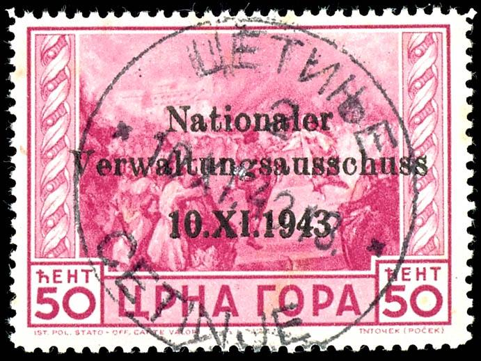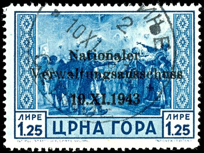 1, 25 liras airmail stamp, cancelled "Cetinje 2 * 10. XI. 43 *" - CTO on the founding day of the management committee dated, the stamp appeared first at the 9. December 1943, photo expertize Brunel BPP (2010) : "the condition is perfect. ", Michel 120.- (12) Certificate 1,25 Lire Flugpostmarke, entwertet "Cetinje 2 * 10.XI.43 *" - Gefälligkeitsstempel auf den Gründungstag des Verwaltungsausschusses datiert, die Marke erschien erst am 9. Dezember 1943, Fotobefund Brunel BPP (2010): "Die Erhaltung ist einwandfrei.", Mi. 120.- (Image)