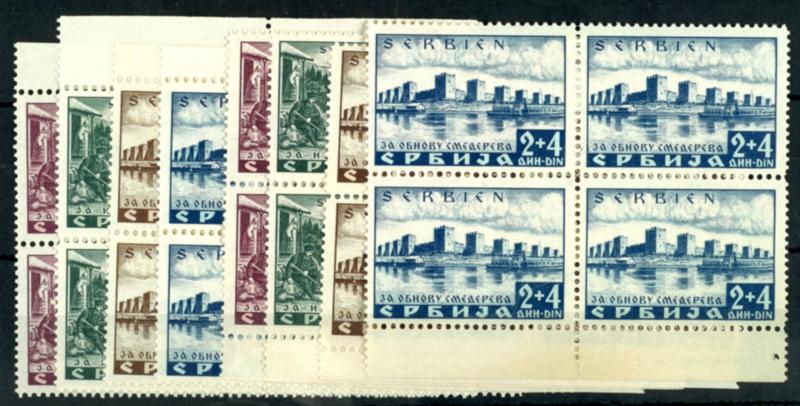 0, 50 plus 1 D. To 2 plus 4 D, Aid for Semedria. Complete set in each case in mint never hinged blocks of four from upper margin and from lower margin. Michel 160,- (46/49) 0,50+1 D. bis 2+4 D., Hilfe für Semedria. Kompletter Satz jeweils in postfrischen Viererblöcken vom Oberrand und vom Unterrand.Mi.160,- (Image)