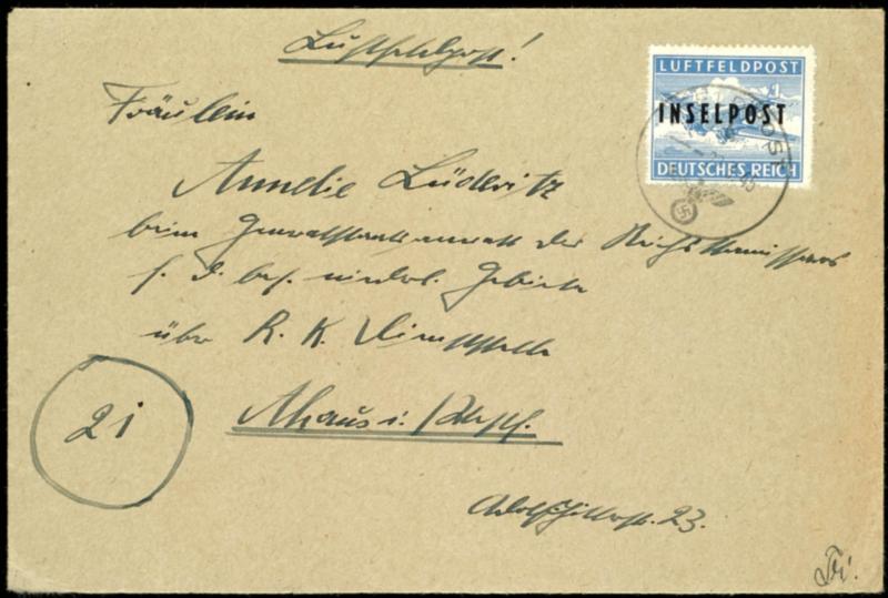 Rhodes rouletted on cover of a member of the 2. Company fortress Infantry Battalion 1002 with fieldpost number 68064 A, with clean standard stamp "b" 22.3.45 to Ahaus, choice copy this difficult issue (8B) Rhodos durchstochen auf Brief eines Angehörigen der 2. Kompanie Festungs-Infanterie-Bataillon 1002 mit Fp-Nr. 68064 A, mit sauberem Normstempel "b" 22.3.45 nach Ahaus, Kabinettbeleg dieser schwierigen Ausgabe (Image)