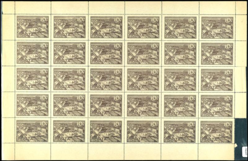 1943, WLASSOW-ARMY, 10 Rouble key value in the complete original sheet to 30 piece, unused without gum, a part margin of sheet missing, complete sheet are rare. 1943, Wlassow-Armee, 10 Rubel Höchstwert im kompletten Original-Bogen zu 30 Stück, ungebraucht ohne Gummierung, ein Teil Bogenrand fehlend, vollständige Bogen sind selten. (Image)