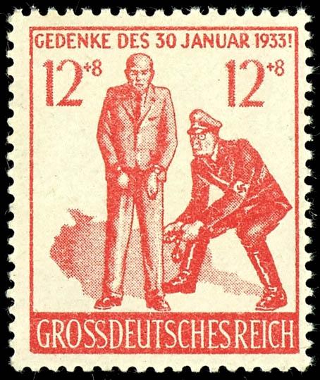 12 Pfg "Himmler trammels civilians", British war propaganda forgery for Germany, mint never hinged extremely fine copy, scarce and rarely offered stamp! (32A) 12 Pfg "Himmler fesselt Zivilisten", britische Kriegspropagandafälschung für Deutschland, postfrisches Kabinettstück, seltene und kaum angebotene Marke! (Image)