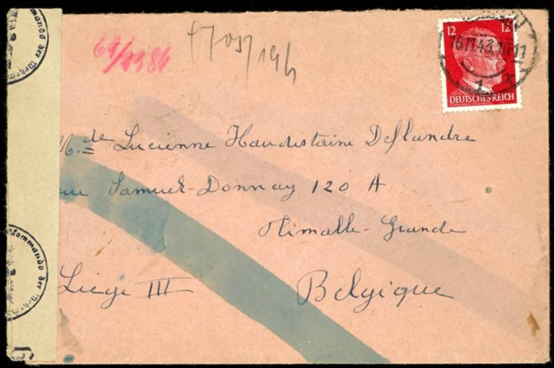 1943, Belgian in labour camp, letter from Essen 16.11.43 with 12 Pfg to Belgium, sender with three-line cancel "community warehouse number 44, Essen Borbeck, Frintroper street", OKW-censorship and on both sides chemical censorship 1943, BELGIER in Arbeitslagern, Brief ab Essen 16.11.43 mit 12 Pfg nach Belgien, Absender mit L3 "Gemeinschaftslager Nr. 44, Essen Borbeck, Frintroper Straße", OKW-Zensur und beidseitig chemische Zensur (Image)