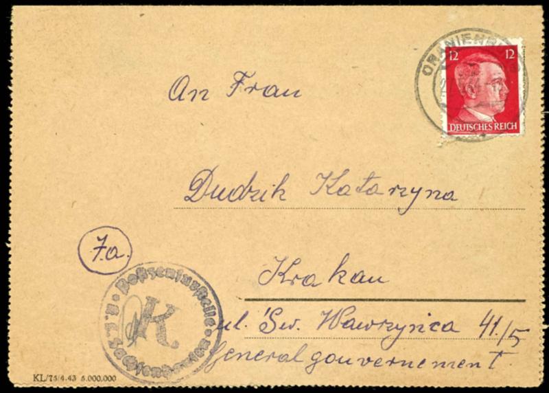 SACHSENHAUSEN, Prisoner folded letter with statement from the camp rules from Oranienburg 27.5.44 to Cracow, censorship single circle postmark "postal service censorship place K / K. L. " SACHSENHAUSEN, Häftlings-Faltbrief mit Auszug aus der Lagerordnung ab Oranienburg 27.5.44 nach Krakau, Zensur-K1 "Postzensurstelle K / K.L. ... " (Image)