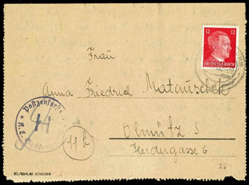 SACHSENHAUSEN, Prisoner folded letter with statement from the camp rules from Oranienburg 3.12.44 with censorship single circle postmark "postal service censorship place K. L. / H" SACHSENHAUSEN, Häftlings-Faltbrief mit Auszug aus der Lagerordnung ab Oranienburg 3.12.44 mit Zensur-K1 "Postzensurstelle K.L. ... / H" (Image)